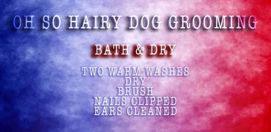 - The bath consists of two warm washes with a natural shampoo. We have a range of natural shampoos to cater for sensitive skin, puppies, greasy coats or white coats to bring out the shine.